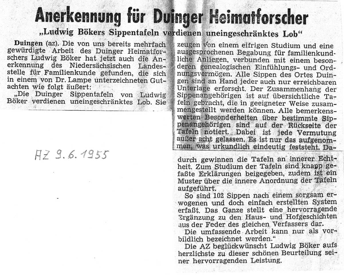 "Anerkennung für Duinger Heimatforscher" Zeitungsartikel, Alfelder Zeitung, 09.06.1955