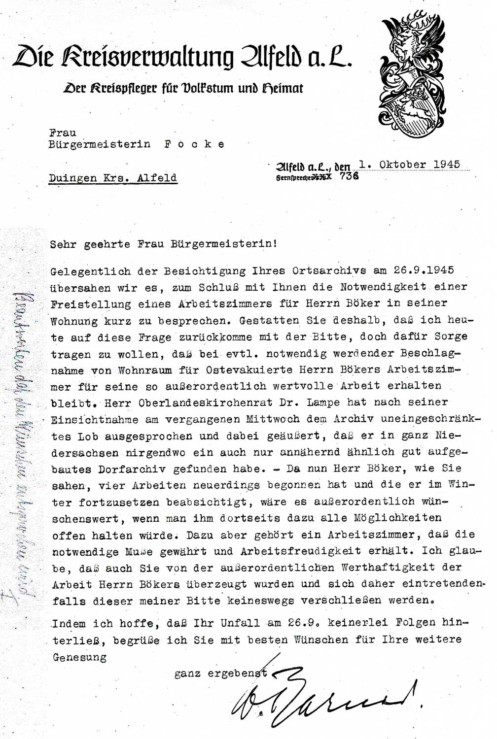 "Brief von Barner an Bürgermeisterin Focke, 01.10.1945" (Links handschriftliche Anmerkung von Frau Focke: "Beantworten, daß den Wünschen entsprochen wird. F.")